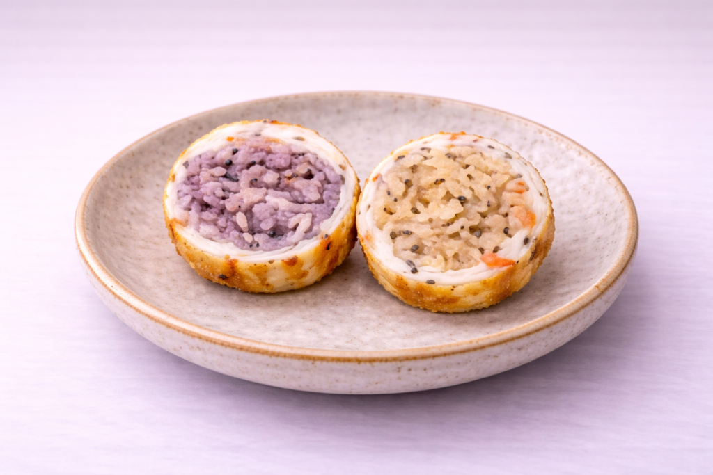 【歴史・特徴】:沖縄の郷土料理である炊き込みご飯「じゅーしー」をおにぎりにし、その周りを魚のすり身で包んで丸ごと油で揚げた、ボリューム満点のご当地ねりものです。外はプリッとした香ばしい揚げかまぼこ、中は豚肉やひじきの旨味が染み込んだご飯という夢のような組み合わせがたまりません。片手で手軽に食べられるため、小腹が空いた時の軽食として県民にも観光客にも大人気です。
